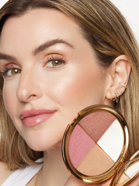 A: Simply sweep the highlighter over your cheekbones, brow bone, eyelids, and inner corners for a radiant glow. Blend the eyeshadow shades for a soft everyday look or a bold evening style.